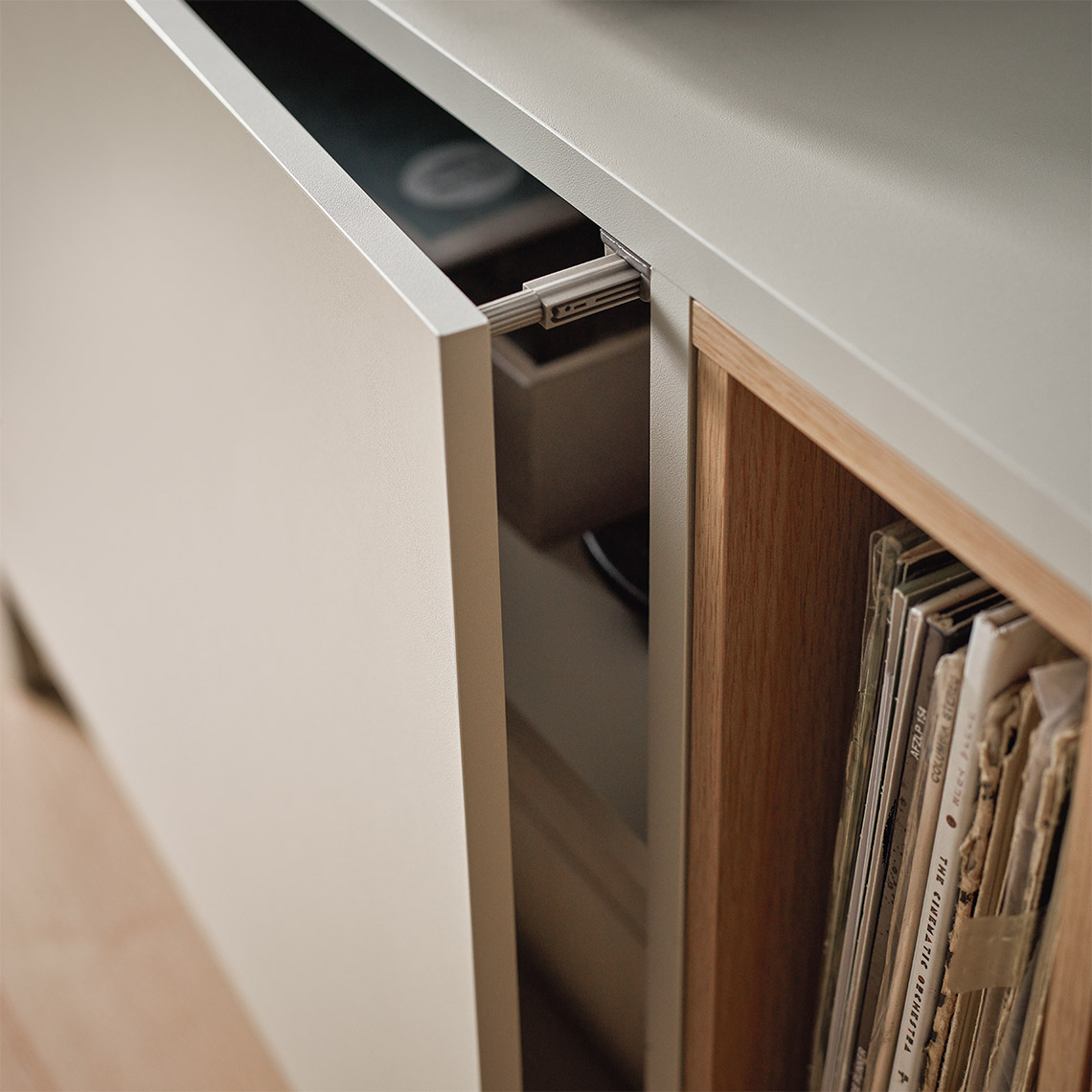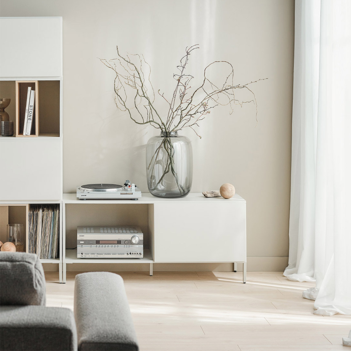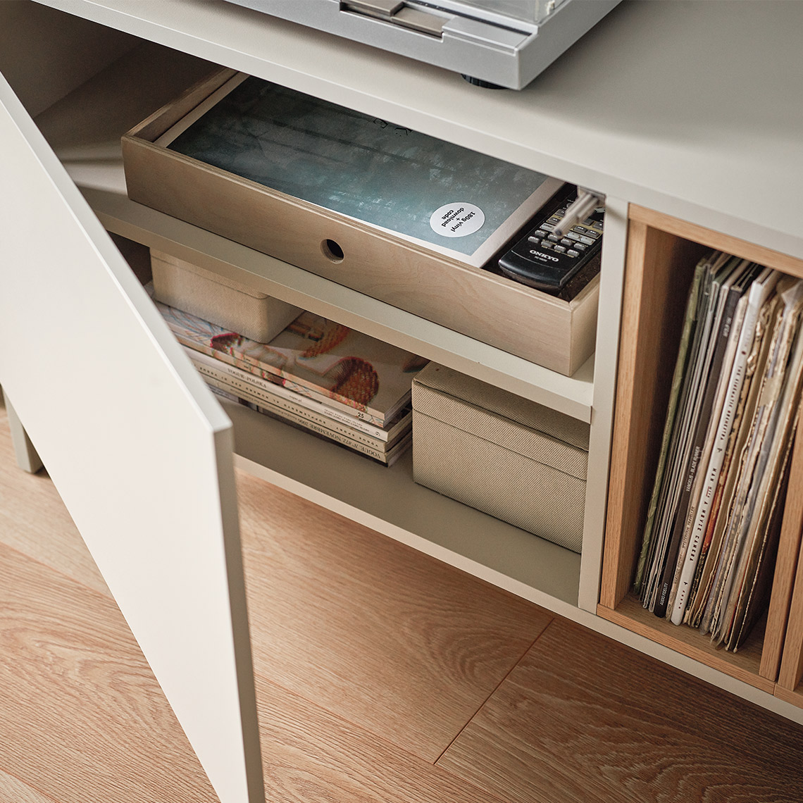 System INTO pozwala swobodnie komponować regały, komody i szafki, które są dopasowane do własnych potrzeb i różnych przestrzeni. W skład intuicyjnego systemu wchodzi szafka, zestaw nóżek oraz skrzynki (duża i mała) przeznaczone do organizacji otwartych przestrzeni szafki. Możesz wybrać gotową konfigurację lub zaprojektować własny mebel, łącząc ze sobą poszczególne elementy.