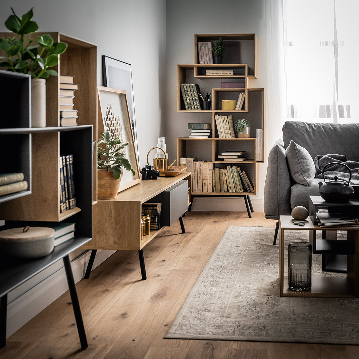 Kolekcja Ribbon składa się z 5 elementów: regał wysoki, niski, szafka RTV, półka wisząca, stoliki kawowe.