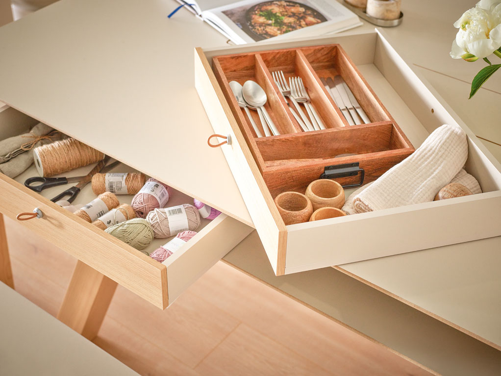 Szuflada to doskonały schowek na sztućce, serwetki czy inne drobiazgi, które warto mieć pod ręką. Dodając szufladę pod blatem, zyskujesz miejsce na podręczne rzeczy bez utraty przestrzeni w kuchni. Możesz też wybrać kilka szuflad i umieścić je w dowolnym miejscu pod stołem z kolekcji 4 You Fresh.