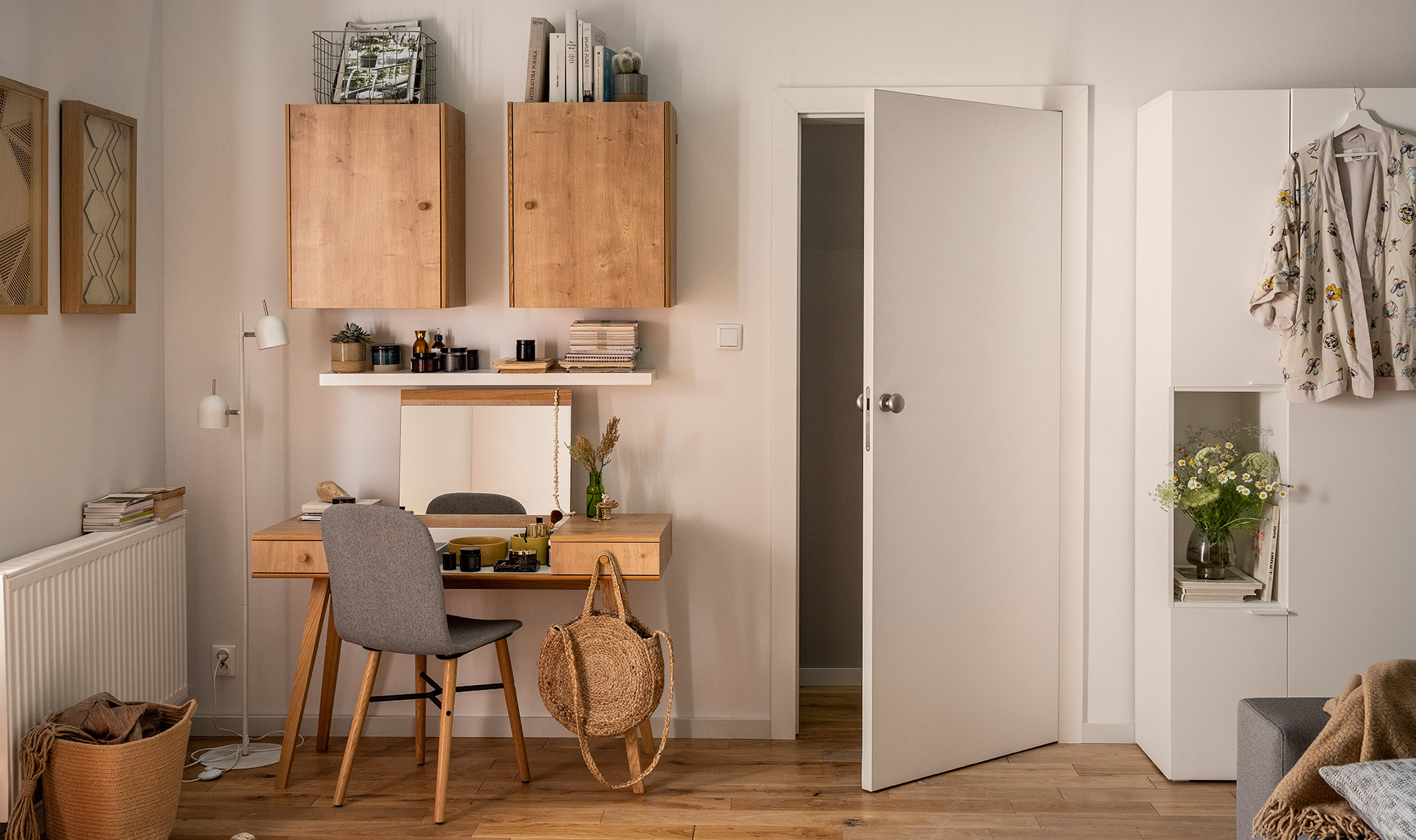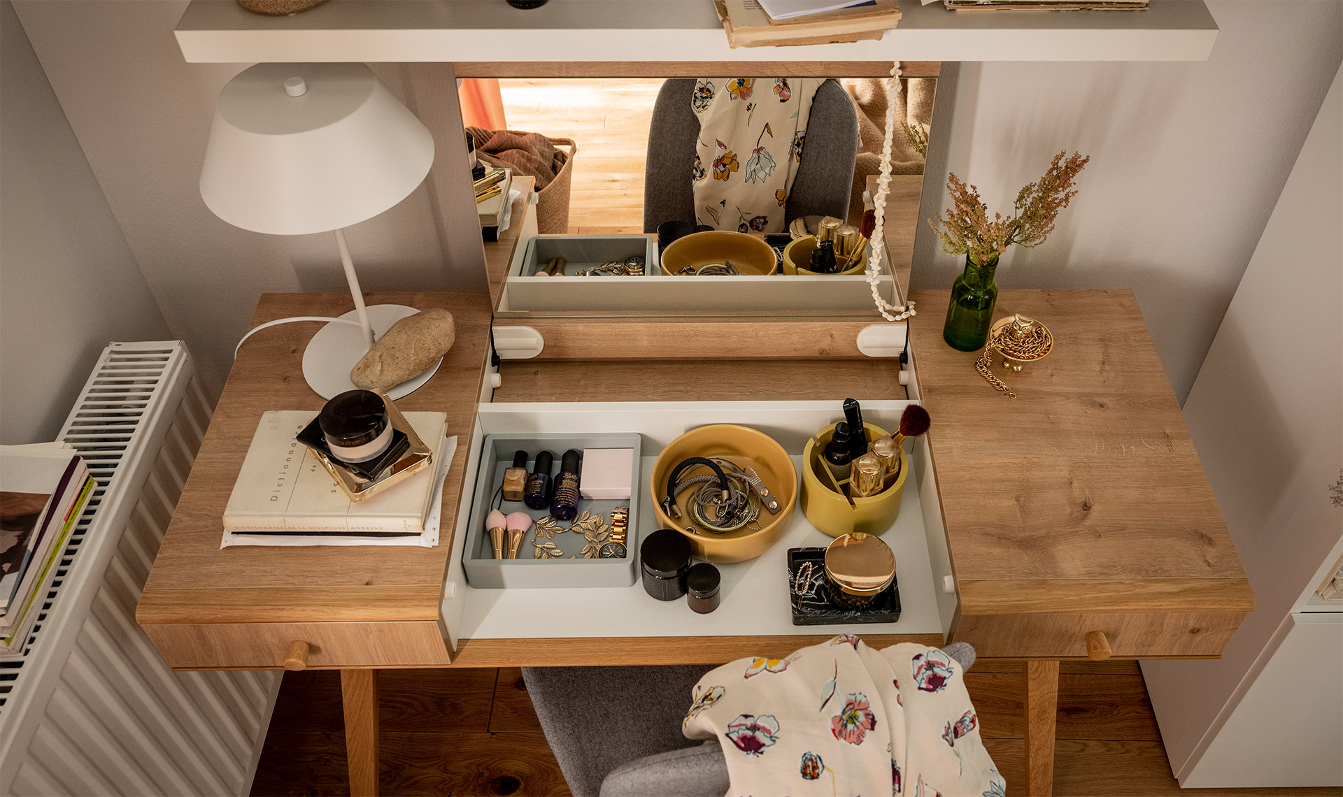 - Dzięki kompaktowym rozmiarom, toaletka sprawdzi się nawet w mieszkaniu o niewielkim metrażu. Sprytne rozwiązania sprawiają, że z powodzeniem może jednocześnie pełnić rolę biurka.