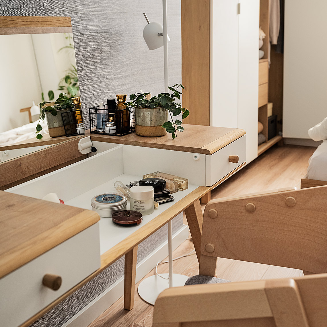 - Po obu stronach toaletki znajdziesz szufladki, idealne do przechowywania kosmetyków do makijażu czy dokumentów. Aby maksymalnie zwiększyć ich wnętrze, umieszczono je na filcach zamiast na prowadnicach. Wygodne, drewniane uchwyty doskonale wpisują się w estetykę mebla.