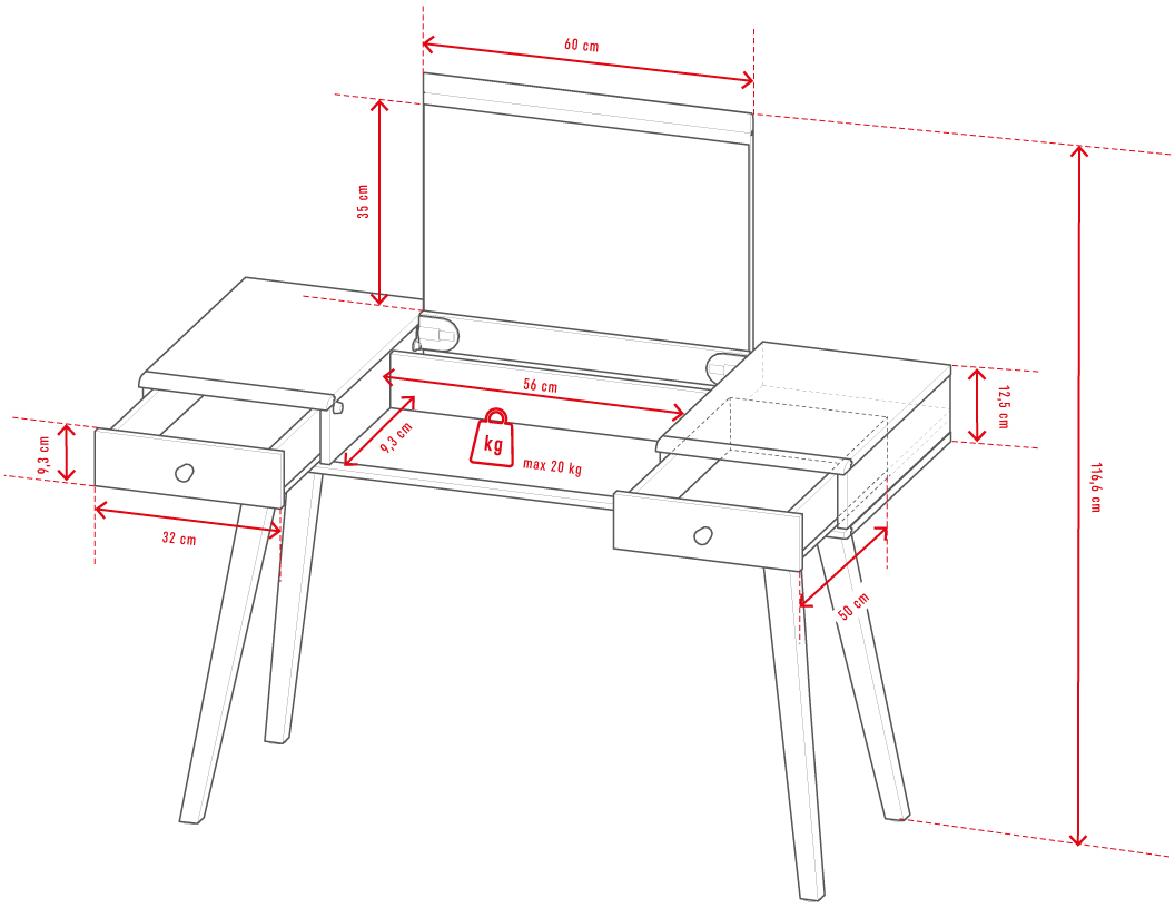 - W centrum toaletki znajduje się duże lustro. Wysokość toaletki po podniesieniu blatu z lustrem, to 116,6 cm. Po jego opuszczeniu zyskujesz wygodny blat, który możesz wykorzystać do pracy, nauki lub rozwijania wszelkich pasji. Mechanizm wolnego opadania chroni je przed uszkodzeniem.