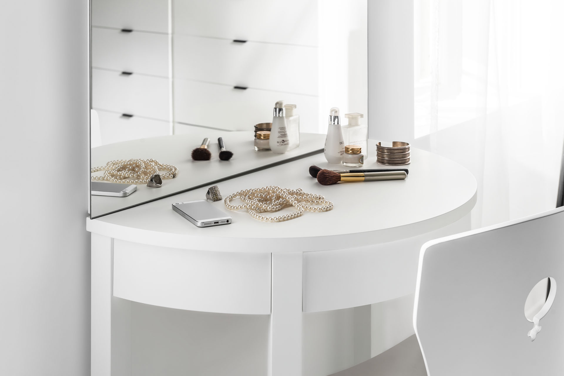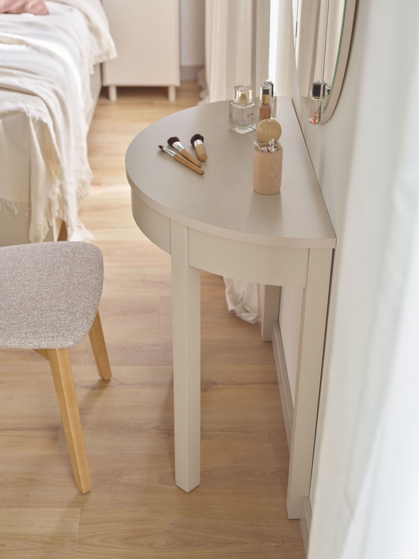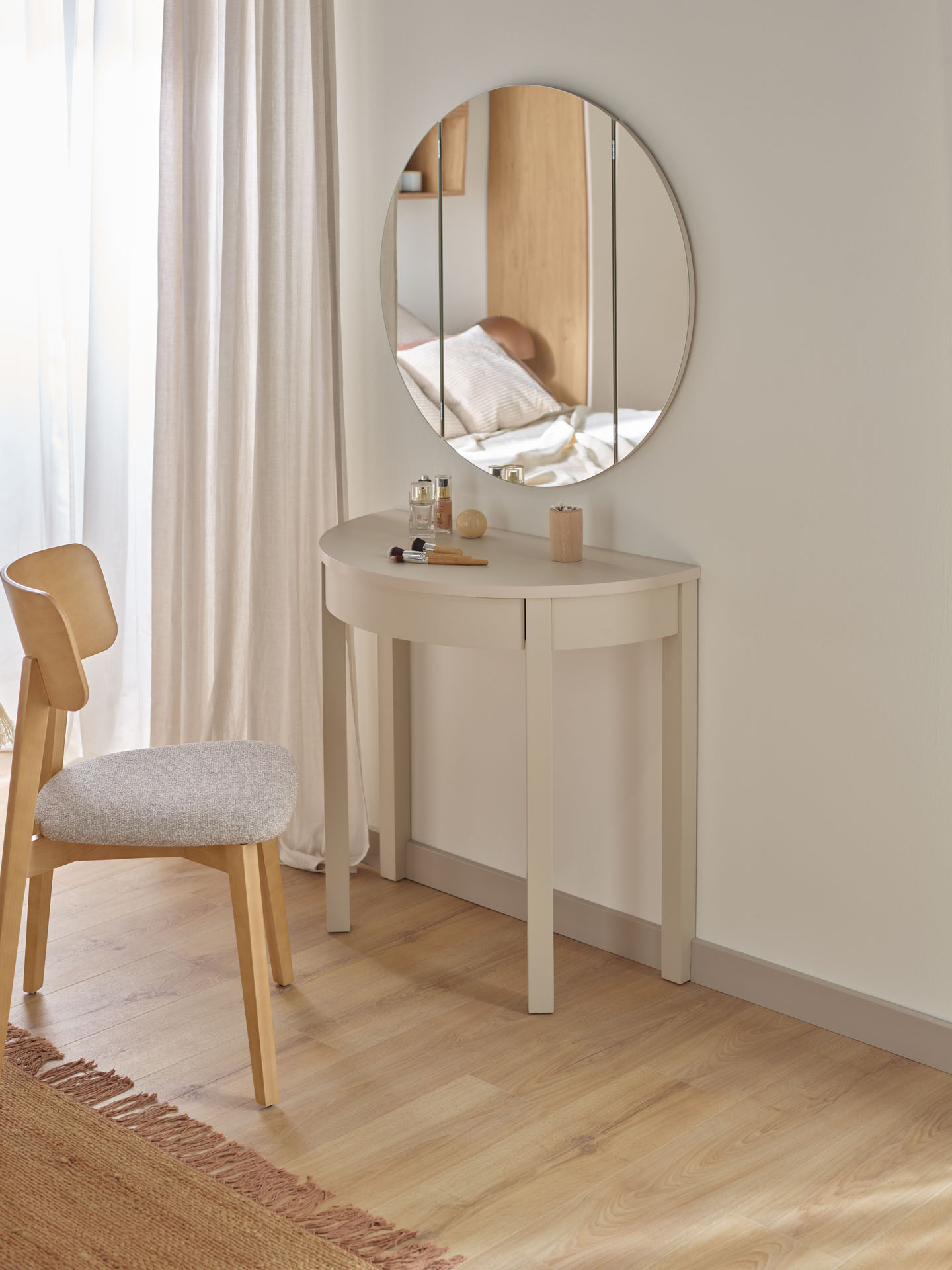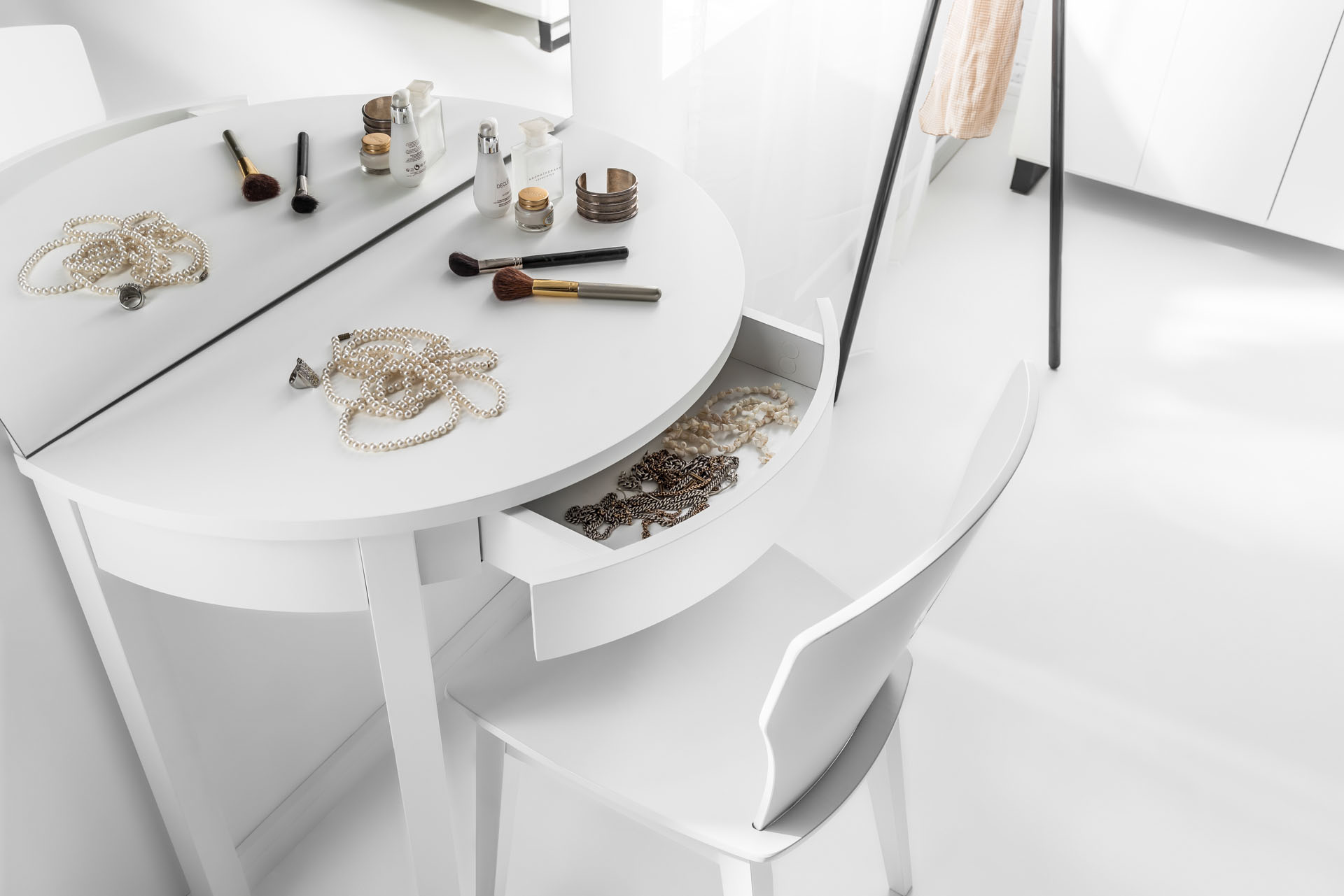 Toaletka Simple to niewielki mebel o wszechstronnym zastosowaniu. Jej blat ma kształt półokręgu, dzięki czemu można ją wygodnie ustawić przy ścianie. Zawiera małą szufladę do przechowywania podręcznych przedmiotów. Toaletkę można łatwo dopasować do aranżacji – jest dostępna w 4 kolorach do wyboru.
