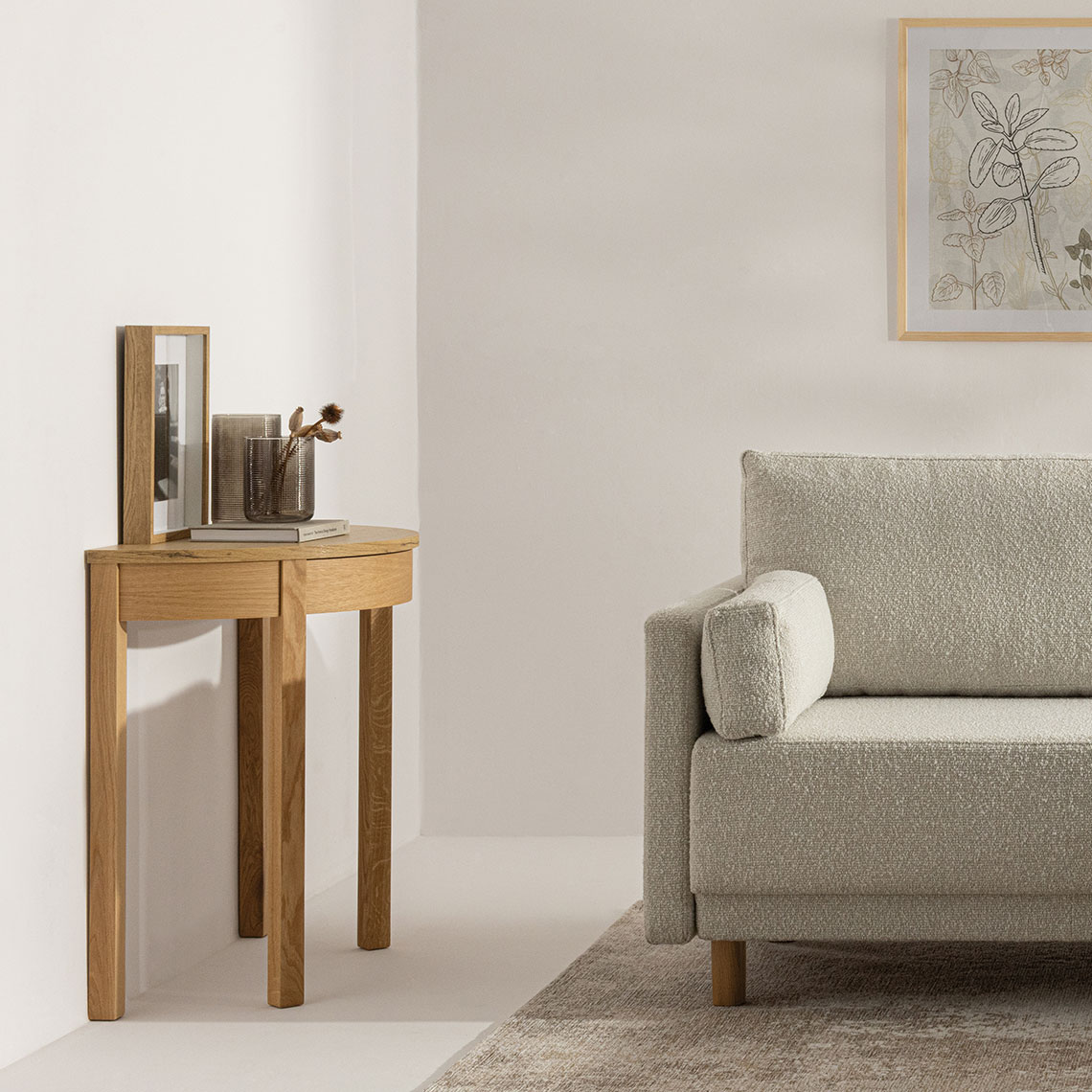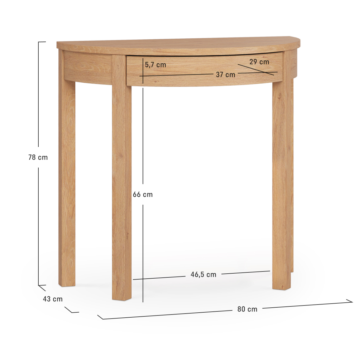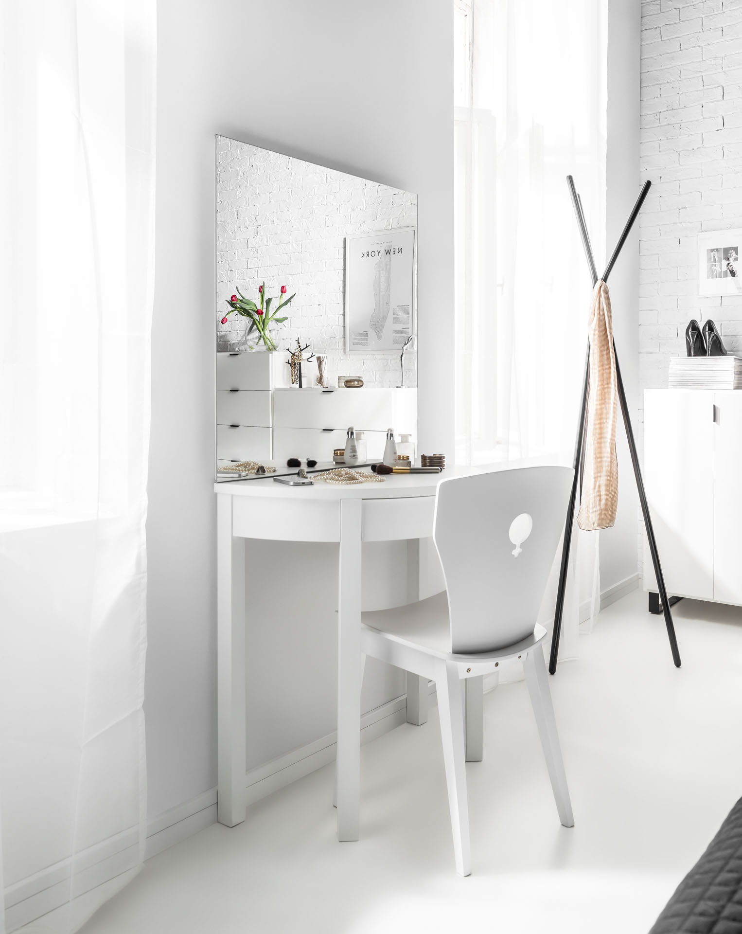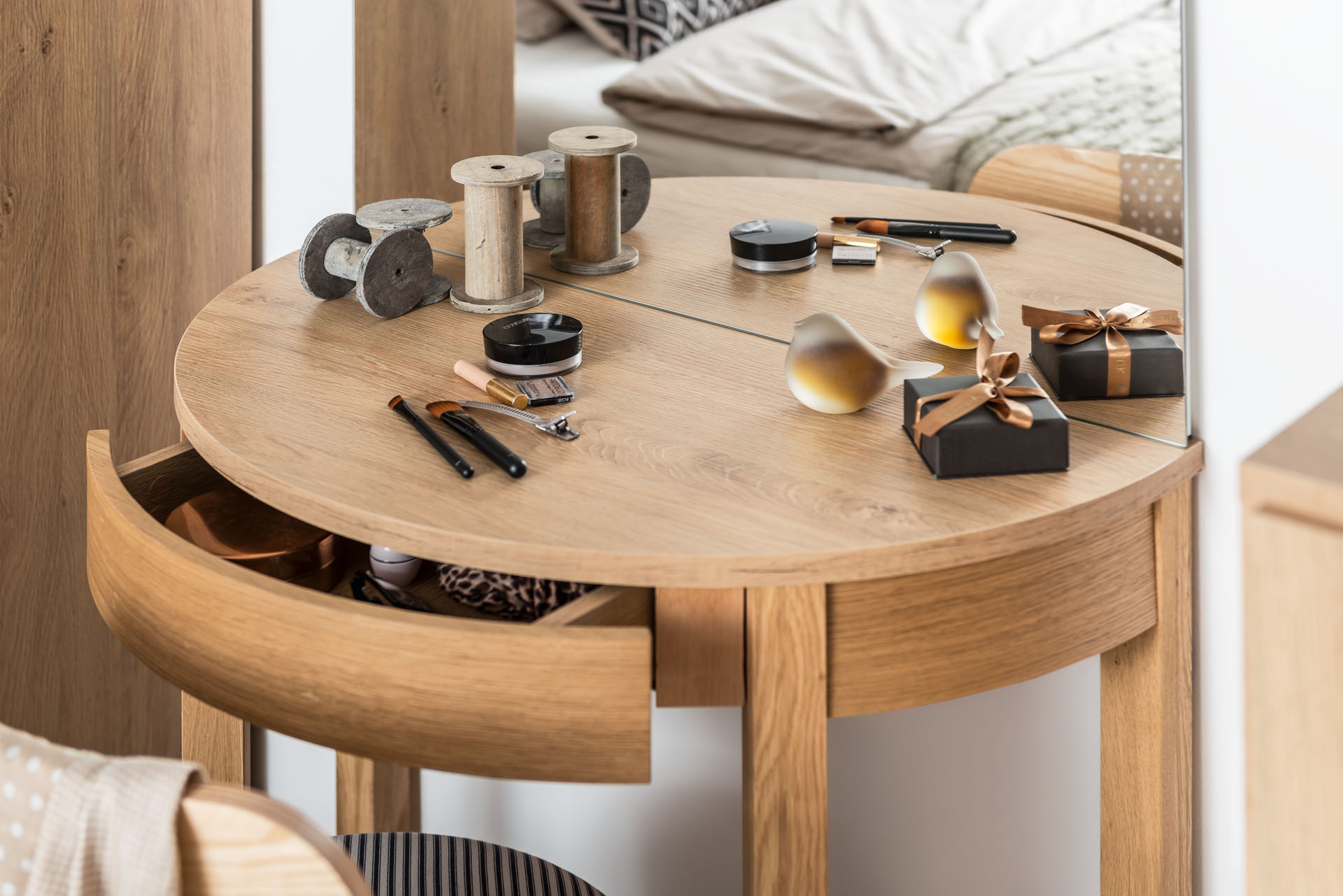 Toaletka Simple to niewielki mebel o wszechstronnym zastosowaniu. Jej blat ma kształt półokręgu, dzięki czemu można ją wygodnie ustawić przy ścianie. Zawiera małą szufladę do przechowywania podręcznych przedmiotów. Toaletkę można łatwo dopasować do aranżacji – jest dostępna w 4 kolorach do wyboru.