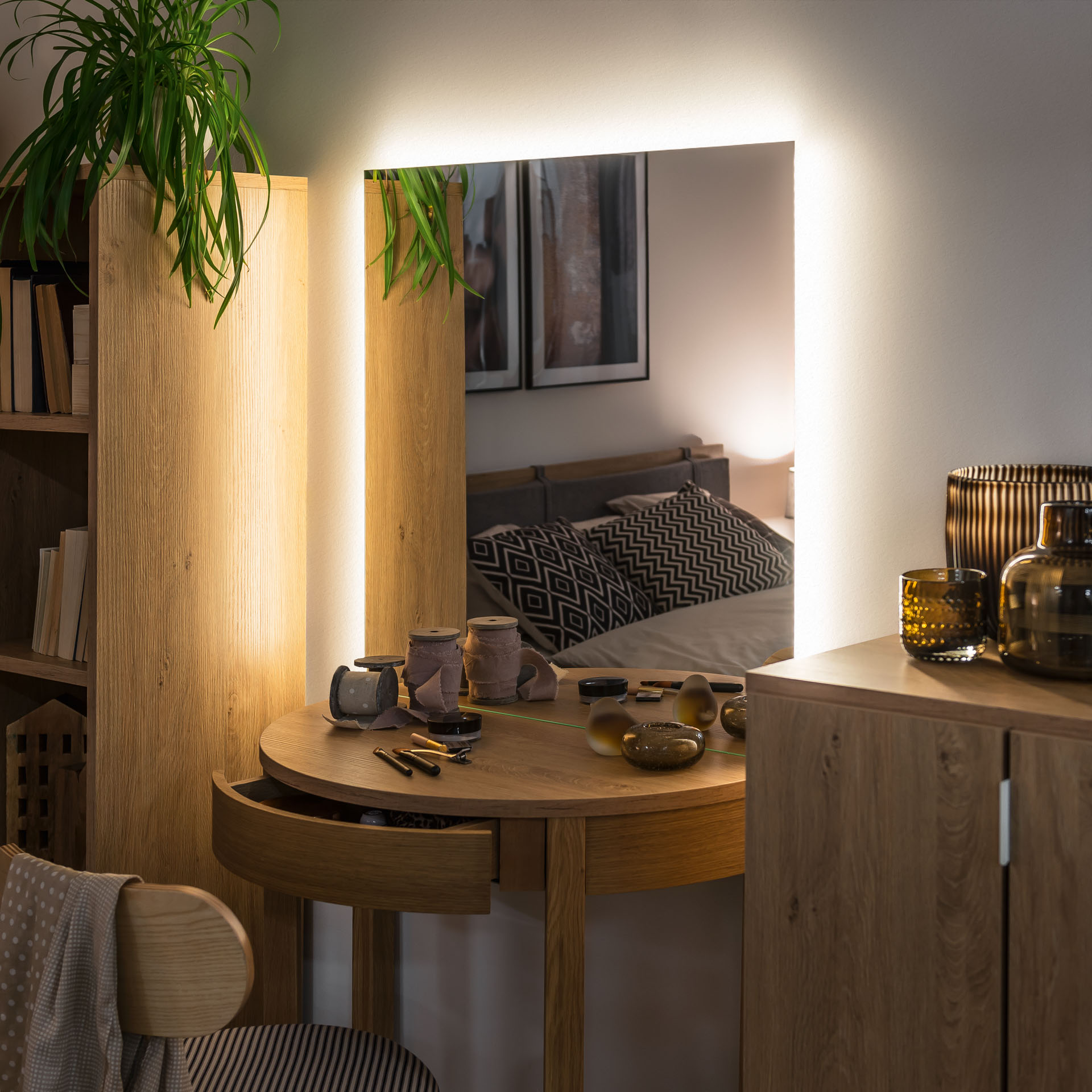 - Nad toaletką warto zamontować kwadratowe lustro z tej samej kolekcji z oświetleniem LED i szerokością odpowiadającą meblowi. Zawieszone tuż nad blatem, optycznie go powiększy, tworząc efektowną iluzję okrągłego stolika. W garderobie świetnie sprawdzi się też okrągłe lustro teatralne z uchylnymi bokami.