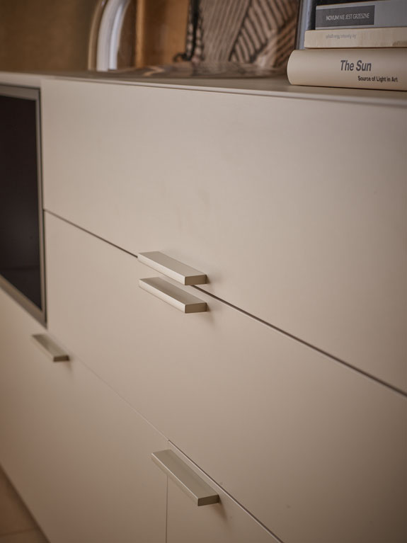 - Beżowy uchwyt został wykonany z metalu malowanego proszkowo na kolor płyty meblowej.
