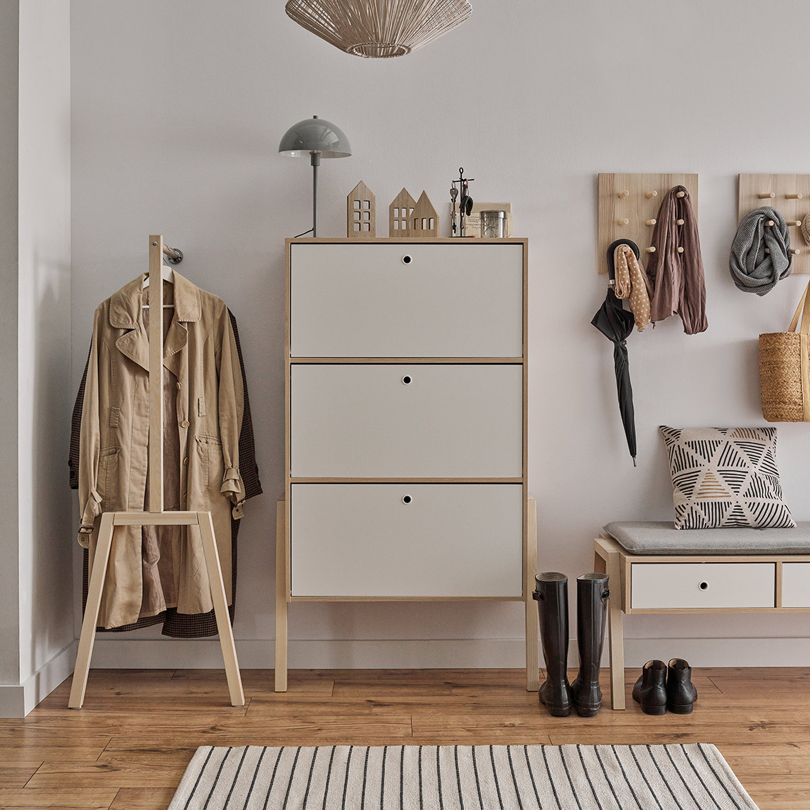 Wieszak zewnętrzny Spot można przykręcić z boku szafy, zwiększając przestrzeń do przechowywania. Drewniane akcesorium ułatwia utrzymanie porządku w przedpokoju, sypialni czy pokoju dziecięcym.