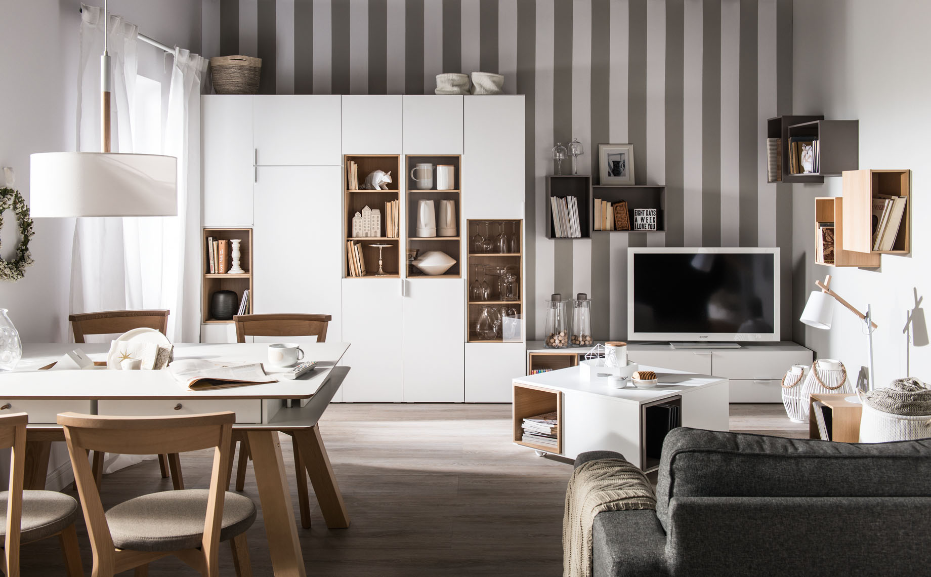 - Witryna składa się z korpusu, kontrastowej wnęki oraz dwóch szafek. Mała na górze, a duża na dole – lub odwrotnie! W zależności od Twoich potrzeb, możesz umieścić szafki tam, gdzie zechcesz w trakcie składania mebla.
