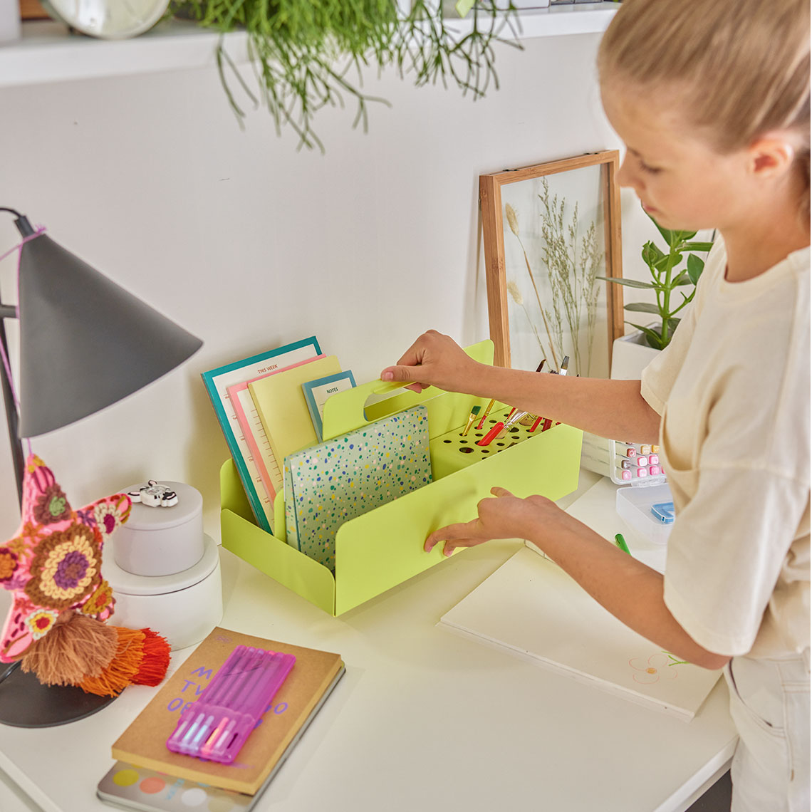 - Wkładkę można ustawić pionowo i wkładać w nią pisaki lub też ułożyć poziomo, by pełniła rolę funkcjonalnej przegródki.