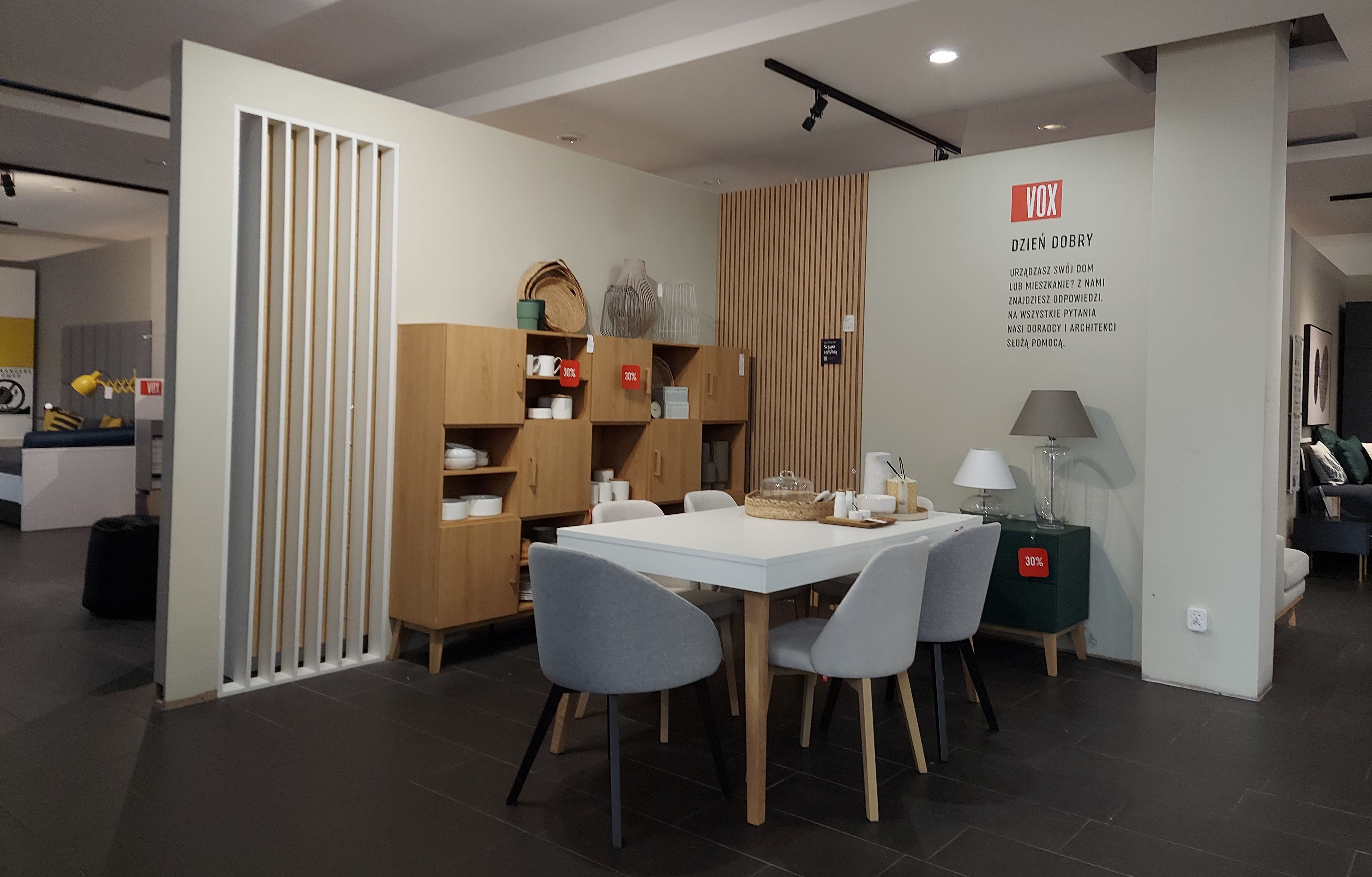 Salon VOX z ofertą mebli i artykułów dekoracyjnych to miejsce pełne pomysłów i inspiracji na wystrój wnętrz. Został zaprojektowany tak, by aranżacje różnych pomieszczeń przypominały realne wnętrza. Wiemy, że niezwykle ważna w procesie zakupowym jest rozmowa z wykwalifikowanym doradcą, który odpowie na wszystkie pytania i rozwieje wątpliwości. Każdy klient może liczyć na kompleksową obsługę i pomoc ze strony specjalistów. Nasi doradcy wesprą w procesie projektowania i wyboru odpowiednich produktów, korzystając z programu VOXBOX stworzą projekt Twojego wymarzonego wnętrza.